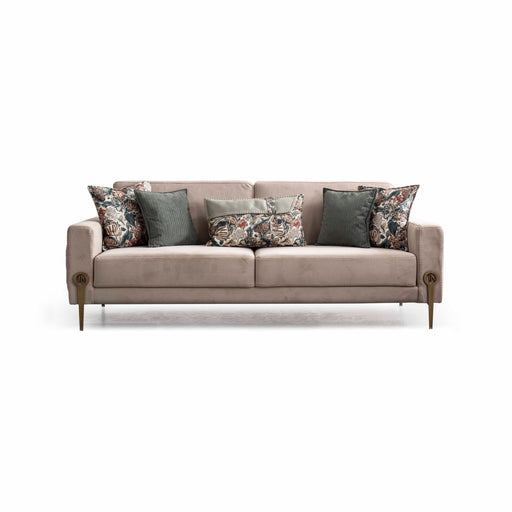 Vezi detalii completeCanapea Lux Zen Asi Home, 3 Locuri, Lemn Nuc, Catifea Crem-Bej & Piele Ecologică Maro, 250x98x85 cm, Spătar și Brate Capitonate